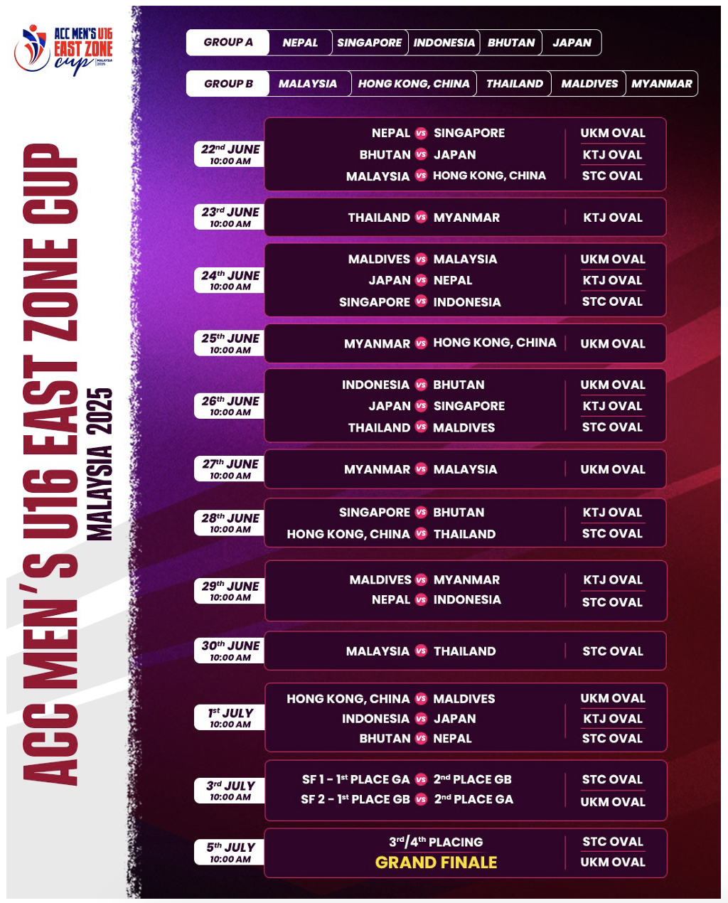 Ten teams are participating in the tournament. Maldives is grouped with Malaysia, Hong Kong China, Thailand, and Myanmar. Team Maldives play their first match on 24 June.