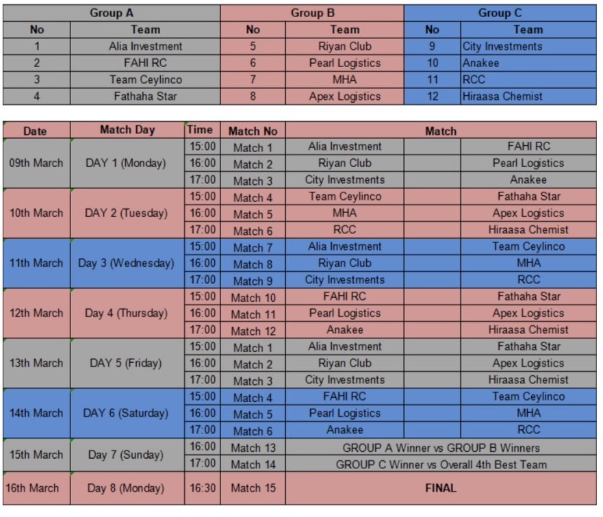Match 2 saw Pearl Logistics make history, defeating Team Riyan by a staggering 154 runs. Pearl Logistics set the highest team total of the 2026 edition with a massive 196/3, powered by retired 34s from Tharak Ruwan, Amila Ranasinghe, and Madumal Perera. Team Riyan was bundled out for just 42, with Gihan Kavinda and Gayan Sameera claiming three wickets apiece.