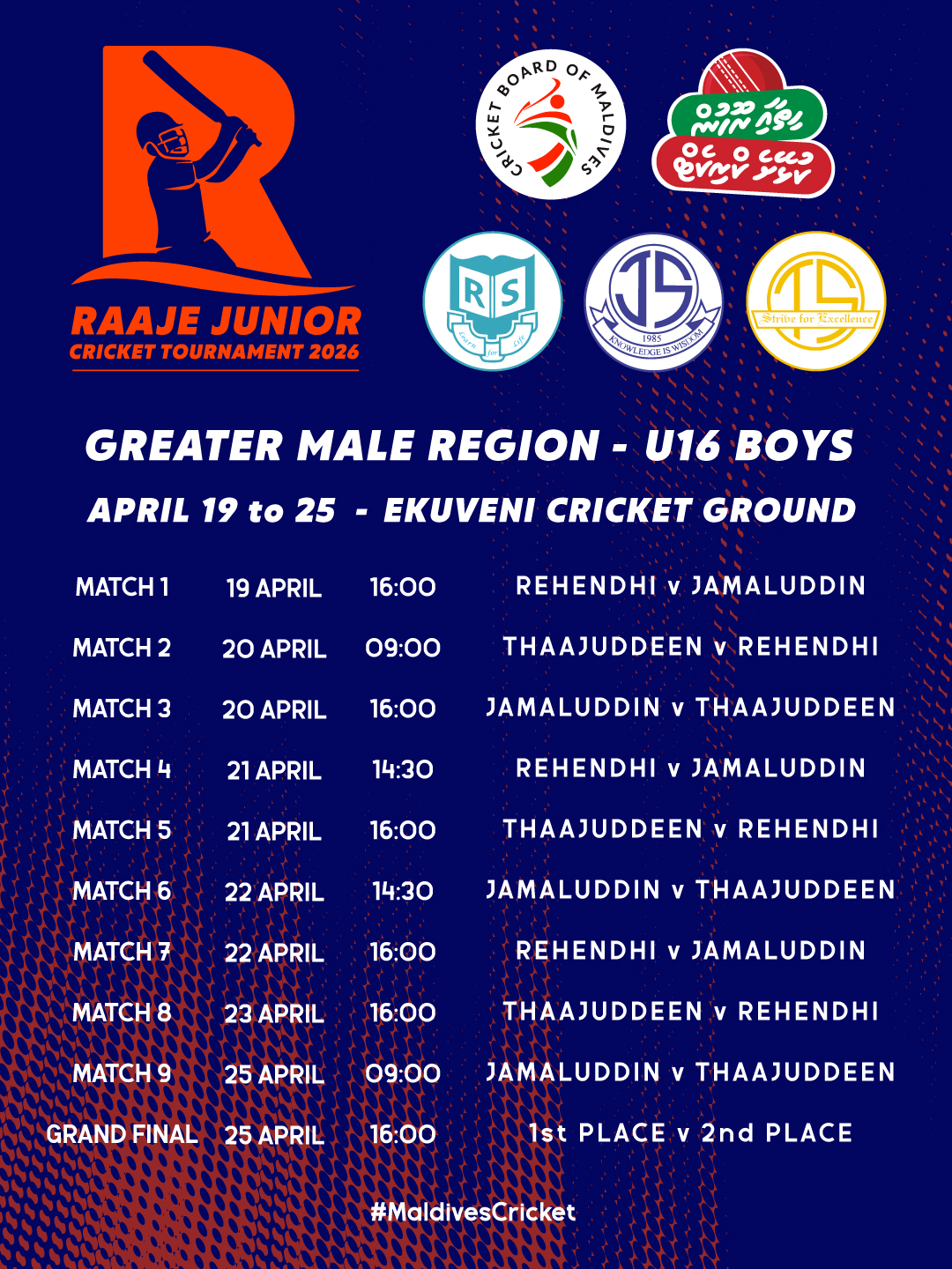 Thaajuddeen School, Rehendhi School and Jamaluddin School will be competing in the first Greater Malé U16 Boys edition of the Raaje Junior Cricket Tournament.
