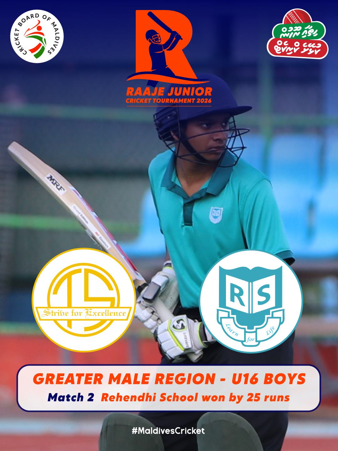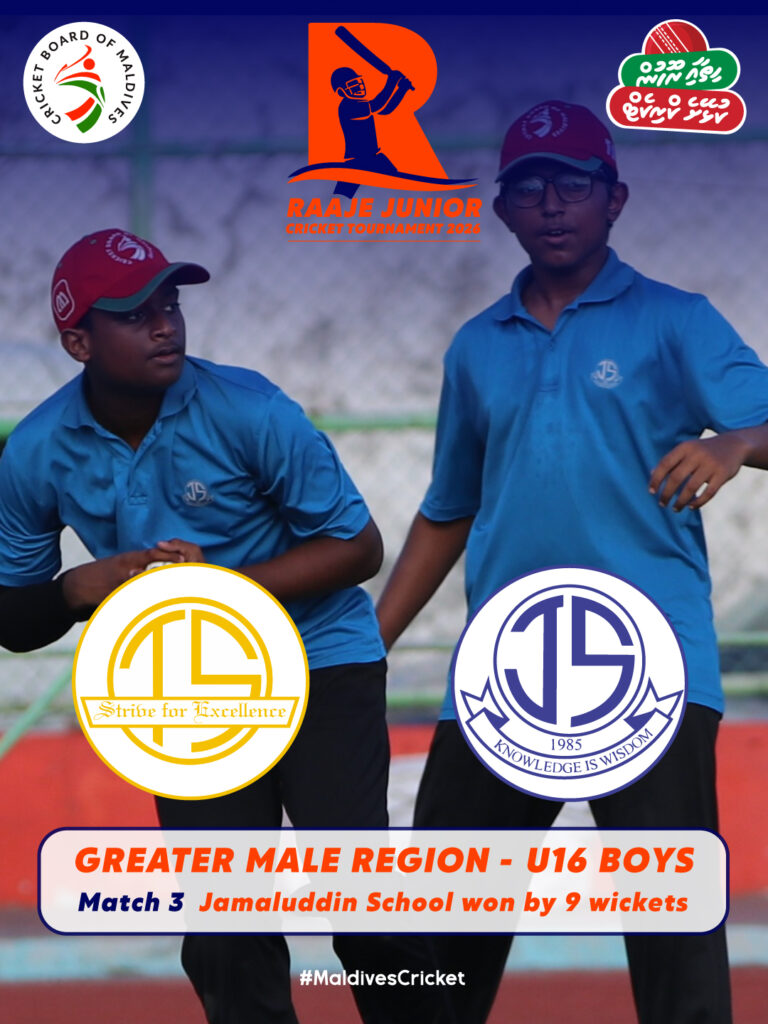 In the Raajje Junior Championship 2026, Jamaaludheen School defeated Rehendhi School by 10 wickets at Ekuveni Cricket Ground, chasing 76 in 7.5 overs after restricting Rehendhi School to 75/1.