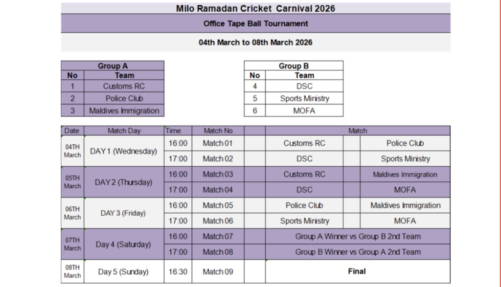 from 4 March to 9 March. Completing the Malé Tournaments is the Company Tournament, with 12 fiercely competitive teams in 3 groups begins on 9 March (3pm) until the grand final match on 16 March.